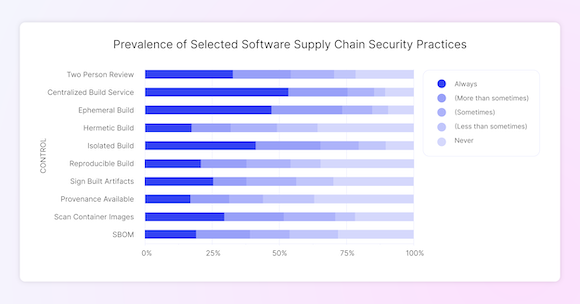 The survey, conducted in the summer and fall of 2022, includes data from nearly 170 respondents at a wide range of organizations, large and small, some security-focused in their role and others not. All respondents answered a series of questions for ten different software supply chain security practices. Three key findings stand out: